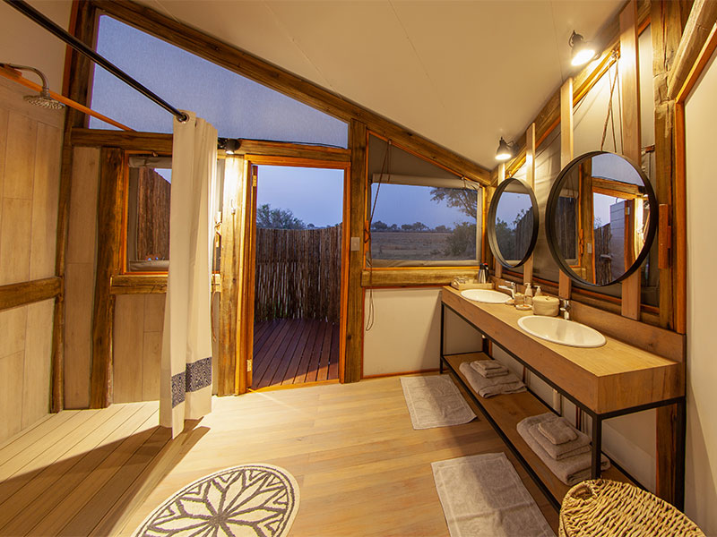 Splash Camp ligt rond een natuurlijke waterput. Elk van de 12 kamers bevindt zich op een terras met uitzicht op de waterput die het hele jaar door wild aantrekt. Alle kamers hebben een eigen badkamer met een toilet, dubbele wastafels en zowel een binnen- als een buitendouche.