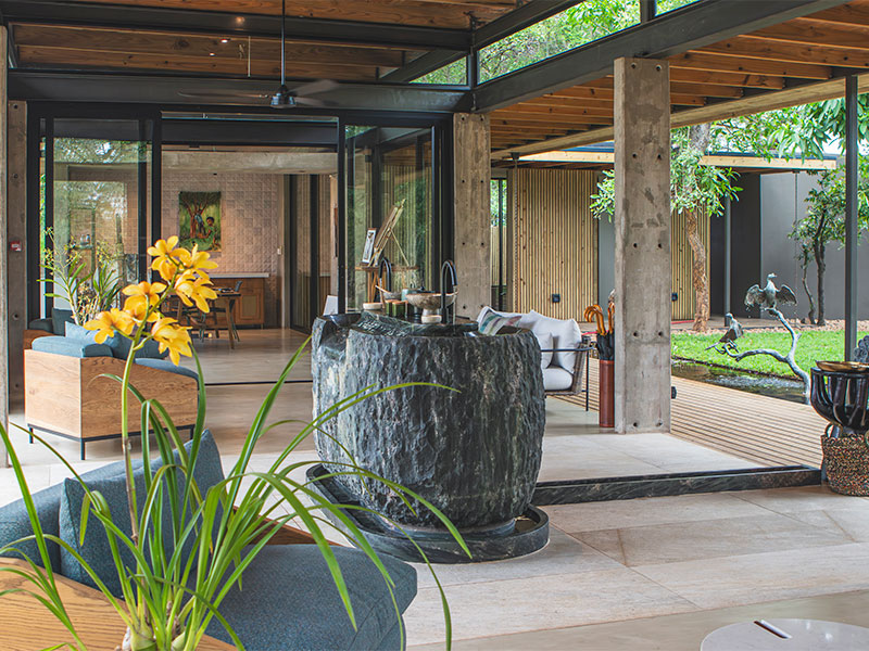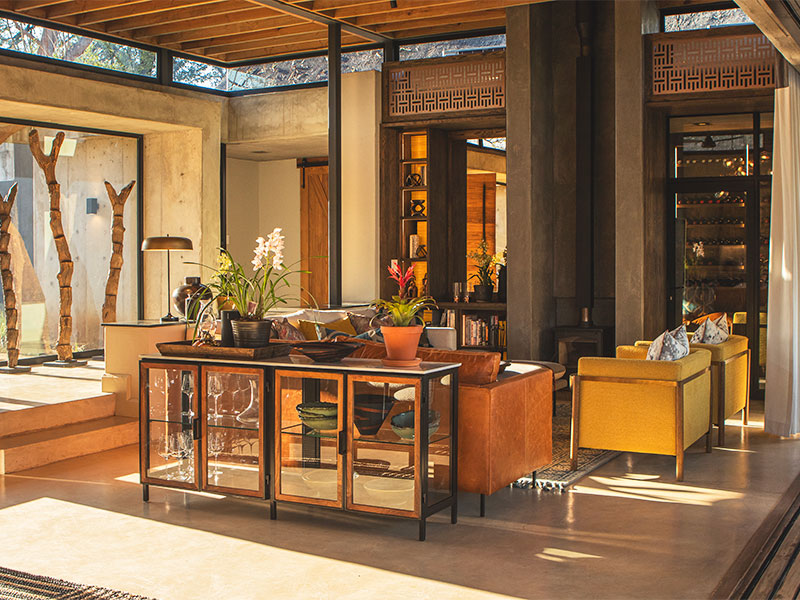 De lodge zelf biedt diverse faciliteiten, waaronder een stijlvolle lounge, bar en bibliotheek, een restaurant met binnen- en buiten dining, een boma (buiten eetplaats bij het vuur), een spa, fitnessruimte, wijnkelder en een groot terras met uitzicht op de rivier.