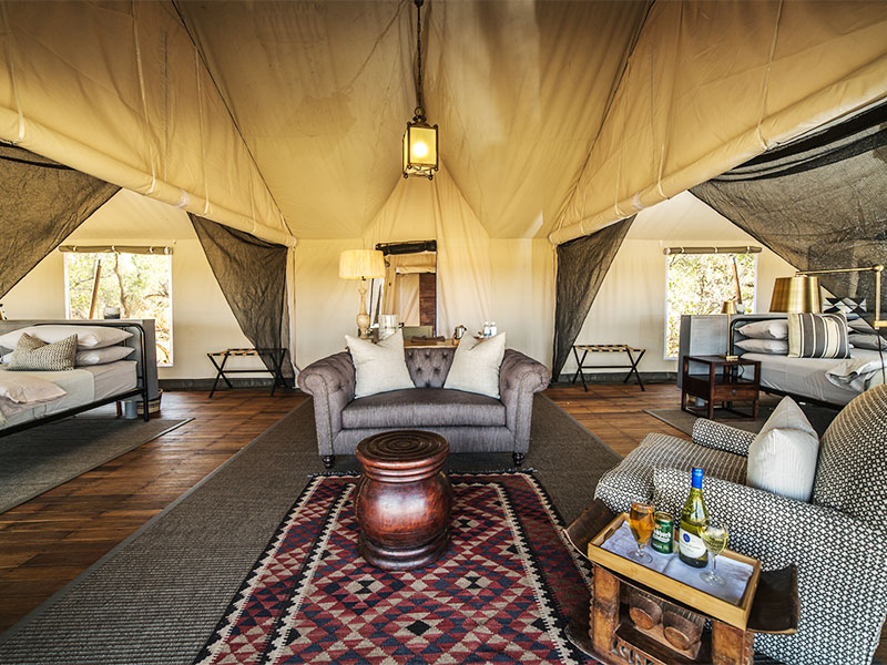 Het kamp bestaat uit slechts 2 ruime safari tenten en 2 familie tenten, elk met een eigen badkamer met toilet en buitendouche. De tenten staan onder grote, oude bomen met uitzicht op de rivier. Little Machaba heeft een eigen hoofdtent met lounge. Verlichting via zonne-energie.