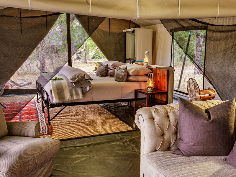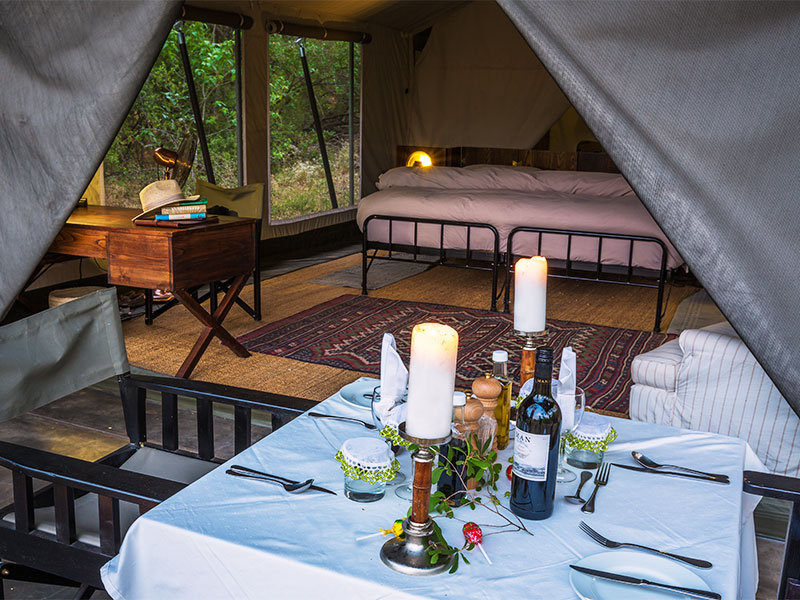 Het kamp is gebouwd in de klassieke jaren 1950-stijl, met luxe safaritenten, en-suite badkamers en lounges, en niet te vergeten de romantische buitendouches. De 10 luxe ingerichte tenten staan onder grote, oude bomen met uitzicht op de rivier.