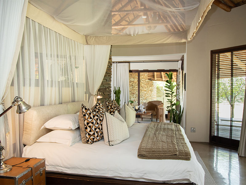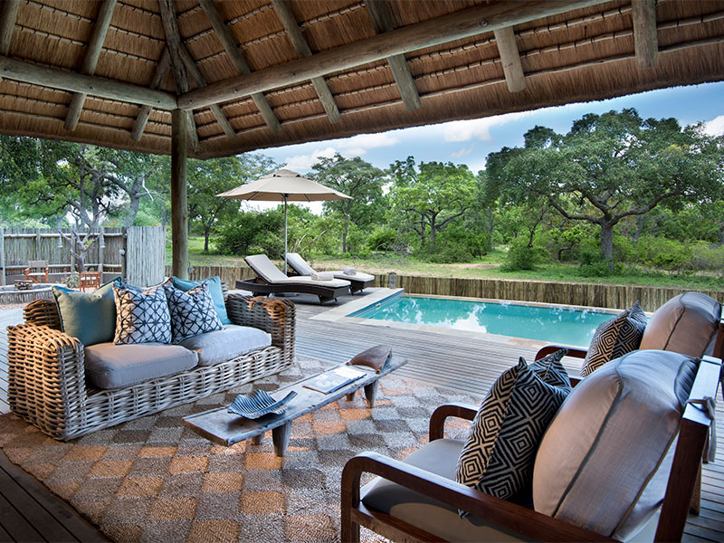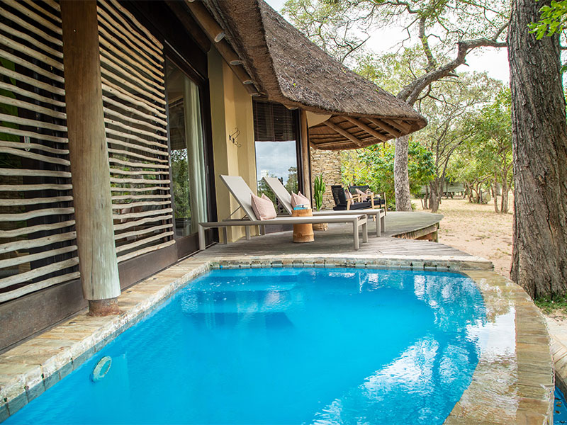 De Marula Suite van de Makanyi Private Game Lodge, die eigenlijk uit 2 slaapkamers bestaat met een aparte loungeruimte, een eigen zwembad en ook een eigen boma, ideaal voor samen reizende stellen of een gezin met tienerkinderen.