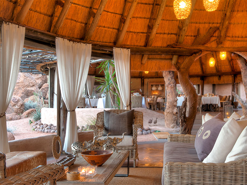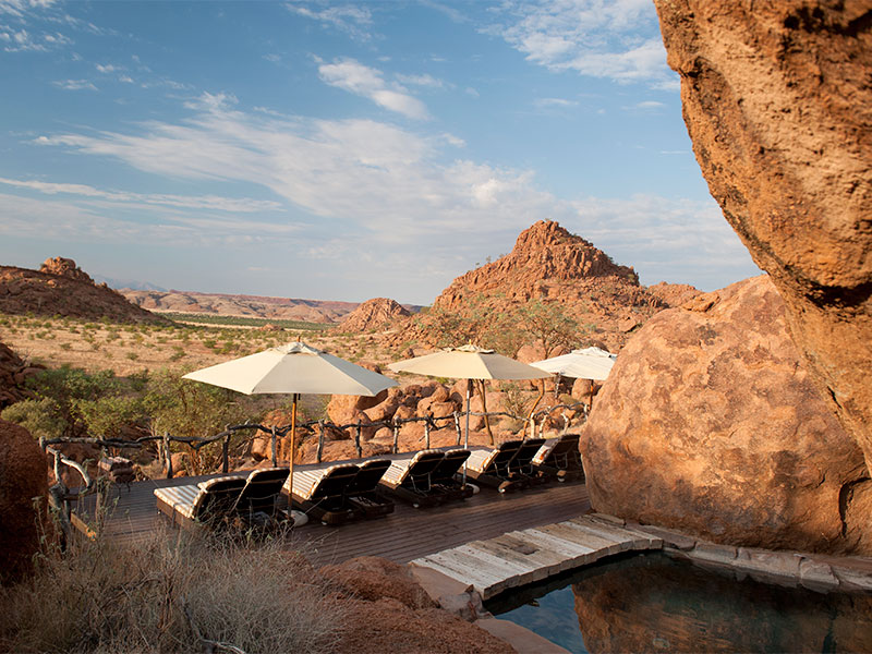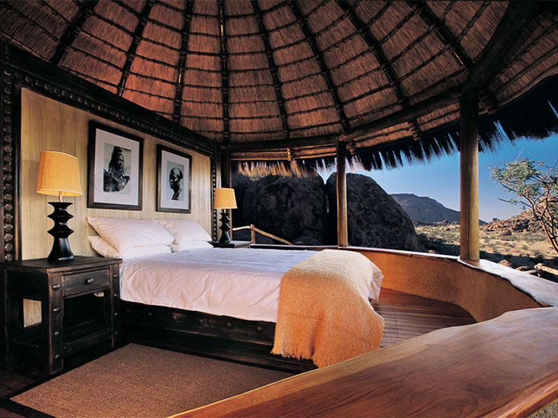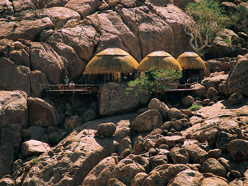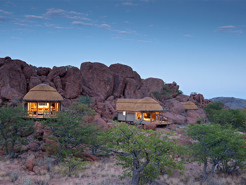 Mowani Mountain Camp is gelegen in het hart van Damaraland te Namibië. Er zijn 12 luxe en-suite safaritenten die op houten platforms zijn gebouwd zijn van alle gemakken voorzien.