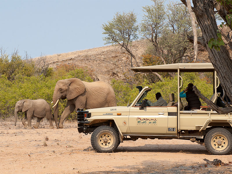 Vanuit Mowani Mountain Camp kunt u een natuurrit maken door het dramatische landschap van Damaraland op zoek naar de (moeilijk te vinden) woestijnolifanten die op zoek zijn naar water en voedsel. Er leven hier tevens veel andere soorten dieren en vogels, die zich geheel hebben aangepast aan de extreme omstandigheden.