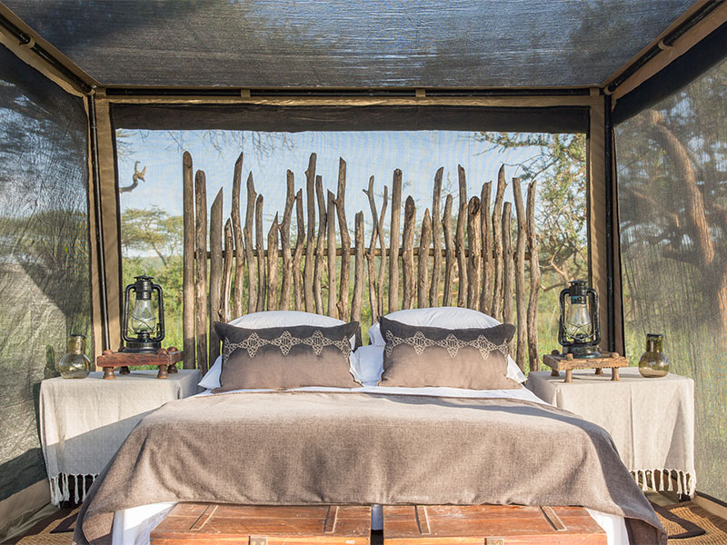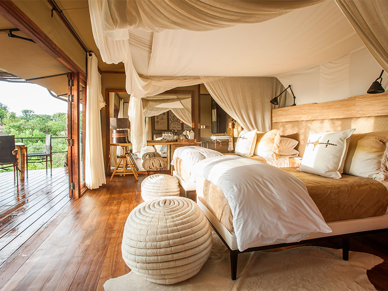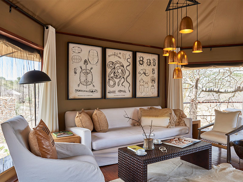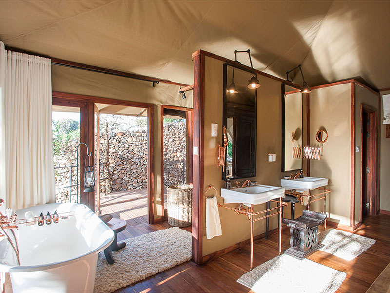 De 10 dubbele tentsuites (waarvan 2 aan elkaar grenzend) hebben allemaal een open lay-out, ontworpen met het doel het meeste uit het spectaculaire uitzicht te halen. Binnen wordt het traditionele canvas geaccentueerd met koperen elementen, grote badkuipen, privé buitendouches en hardhouten terrassen.