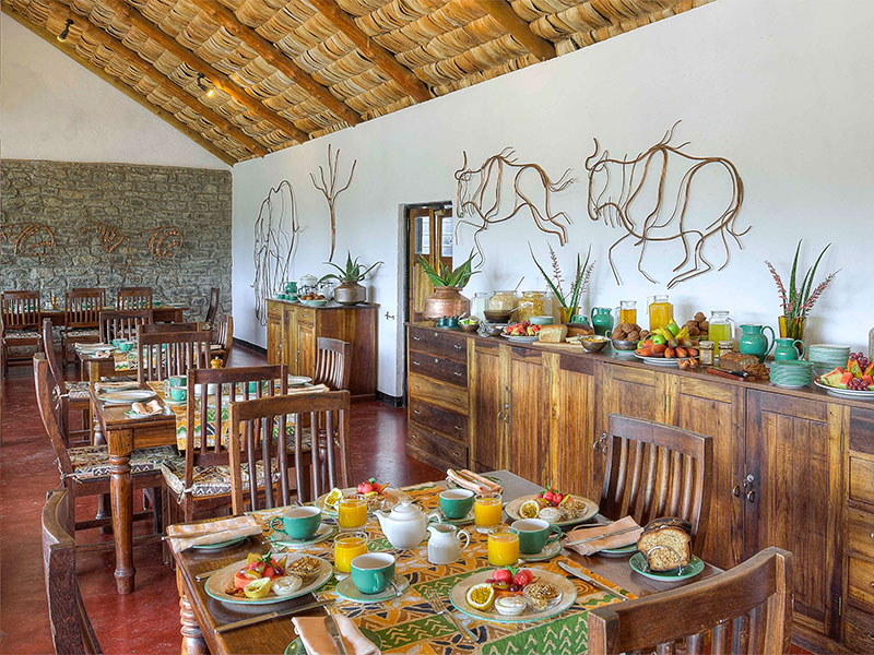 Het is altijd een genoegen om te ontbijten en te dineren in de open hal van de Ndutu Safari Lodge, waar de dieren op slechts 200 meter afstand voorbij trekken en de glans- spreeuwen het ontbijt van uw bord proberen te stelen...