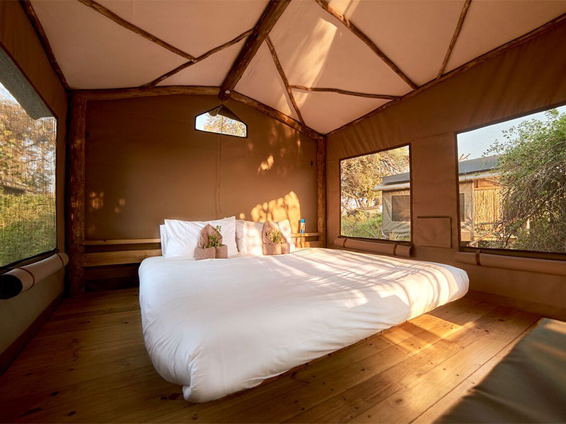 Accommodatie is in eenvoudige, comfortabele 3m x 3m tenten (inclusief twee familie-tenten) op verhoogde houten houten platforms, elk met uitzicht op de omliggende bush. Elke tent heeft zijn eigen rustieke en-suite faciliteiten, waaronder warm en koud stromend water voor de al fresco emmer-douche - in ware safaristijl.