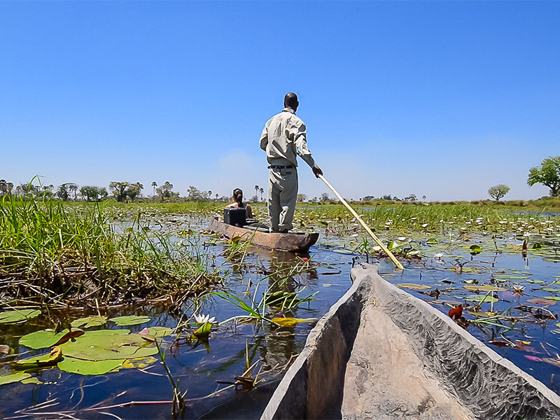 Oddballs 'biedt geen gemotoriseerde activiteiten. Elke gids heeft zijn eigen mokoro (lokale houten kano) waarin hij u meeneemt door de Okavango naar nabijgelegen eilanden, waar hij u door een prachtig landschap voert om de flora en fauna te bekijken.