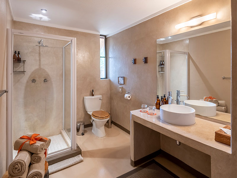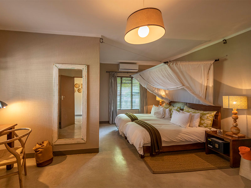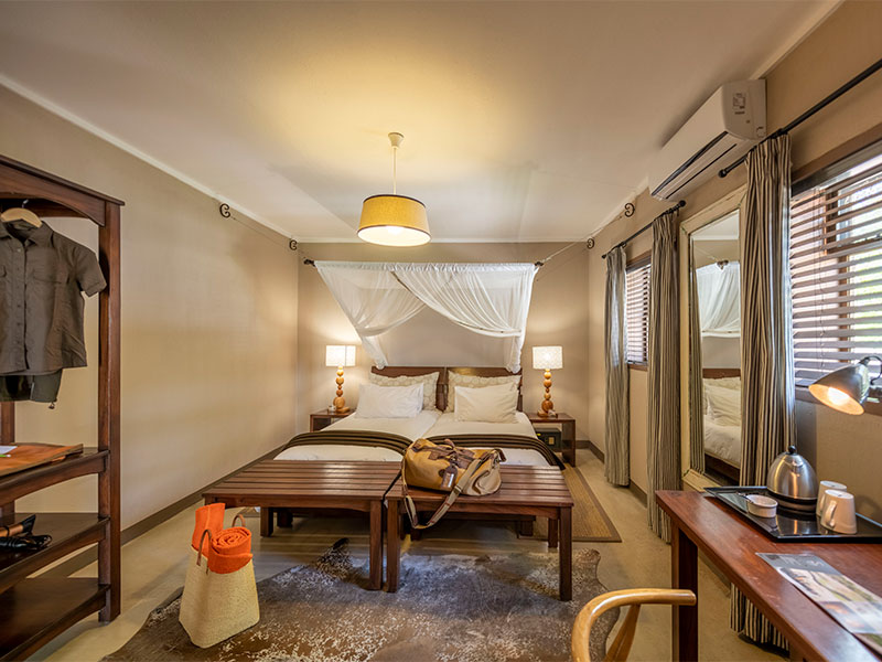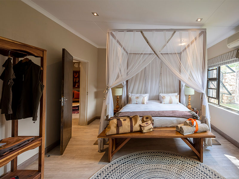 Bush Camp beschikt over 8 standaard kamers, 3 kamers met een vide voor 2 kinderen, 3 rondavels, 3 familiekamers en 1 luxe Settler’s Room. De lounge en het restaurant kijken uit over een drinkplaats, waar dieren hun dorst lessen. Voor warme dagen is er een zwembad. In de bar kunt u genieten van een verkoelend drankje.