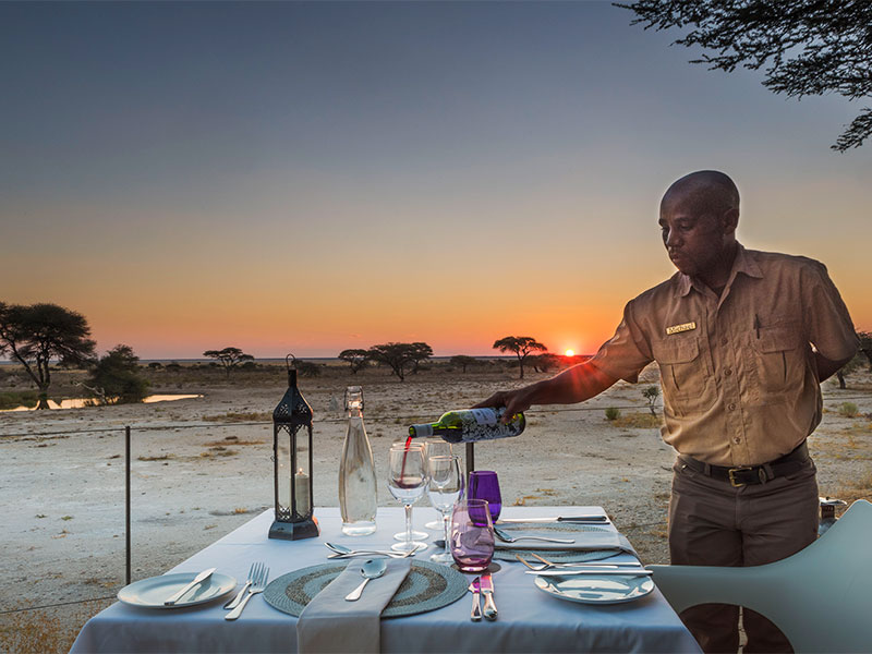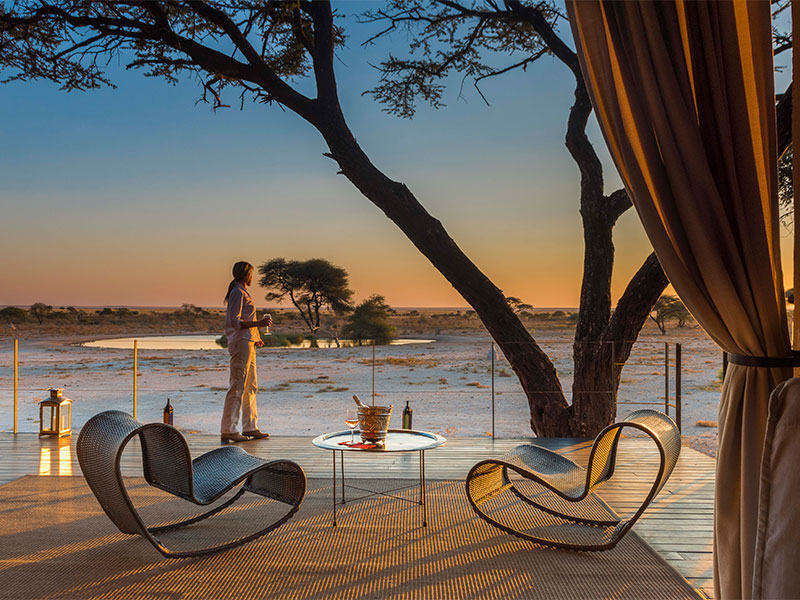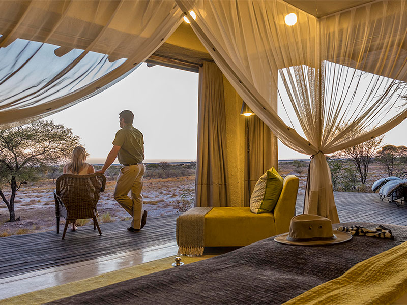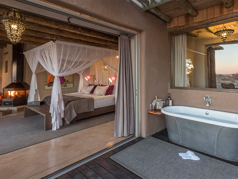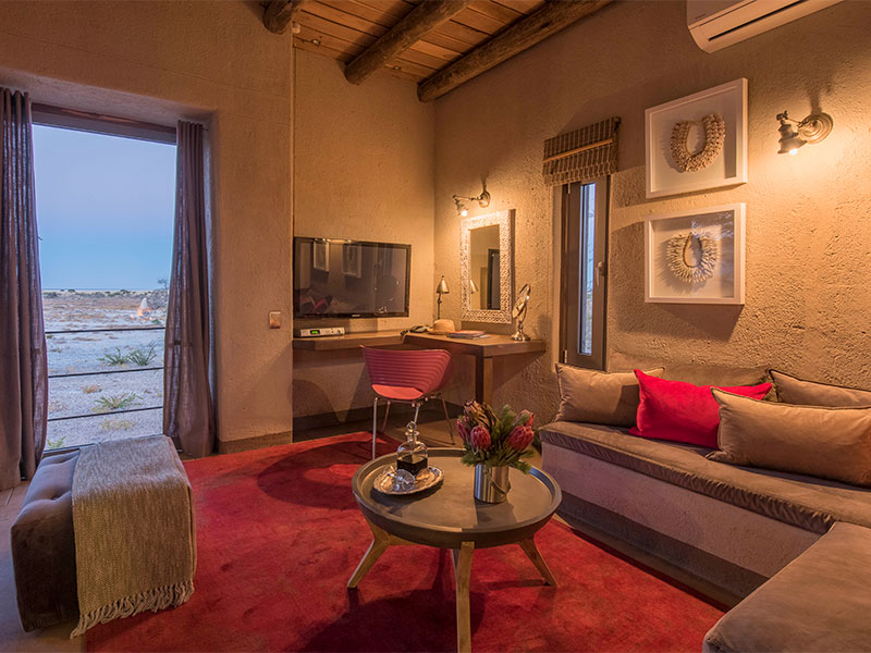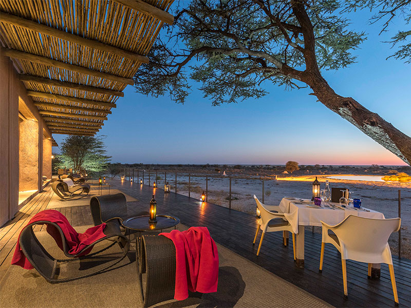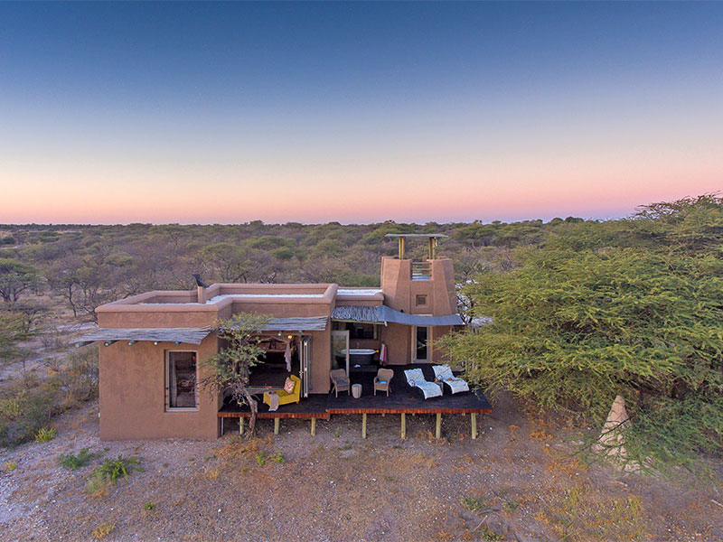 Op de achtergrond ligt het droge zoutmeer Fischer’s pan. Het vervoer van en naar het hoofdgebouw gaat met golfkarretjes in verband met de wilde beesten die kunnen rondlopen. Er is een zwembad met zitgedeelte en een open restaurant met uitzicht op de drinkplaats.