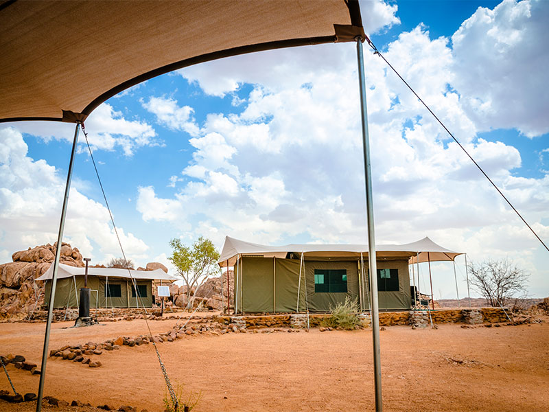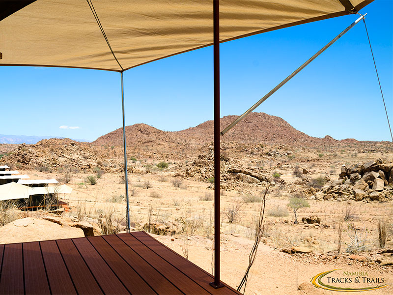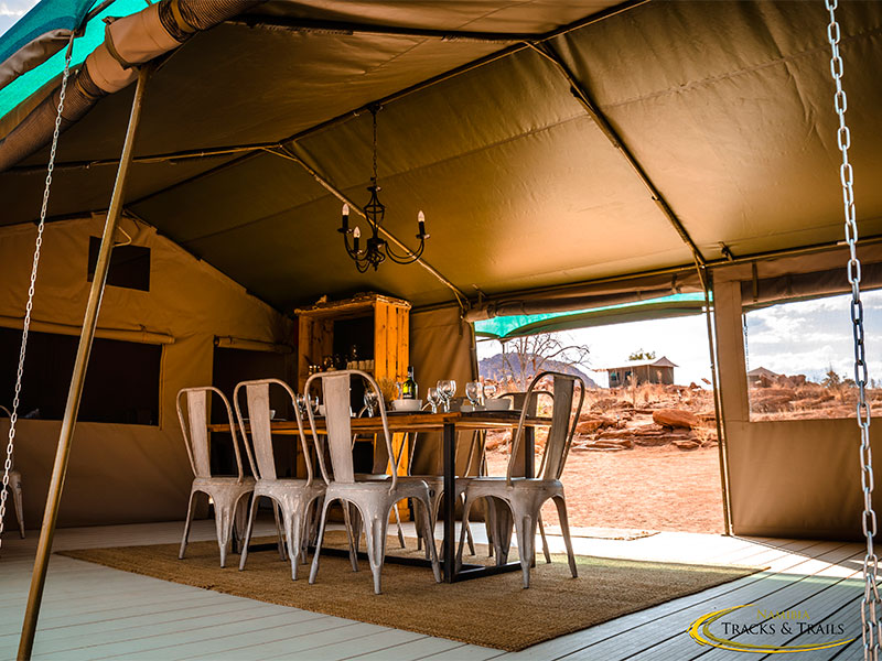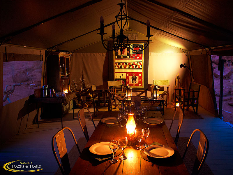 Het gemeenschappelijke gedeelte bestaat uit een eettent met zithoek, eettafel, die uitkomt op een zitgedeelte bij de vuurplaats met uitzicht op de rivier de Ugab.