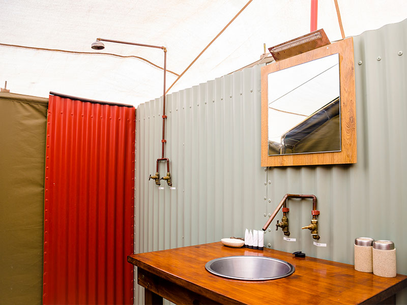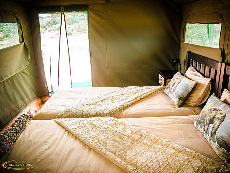 Ozondjou Trails heeft 8 2-persoonstenten met 2 bedden met een en-suite badkamer met douche, wastafel en toilet.