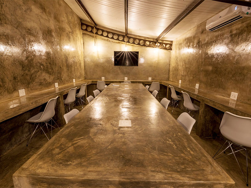 Op de bovenverdieping is de bar, met een tafel gewijd aan het bewerken van foto's en het geven van workshops.