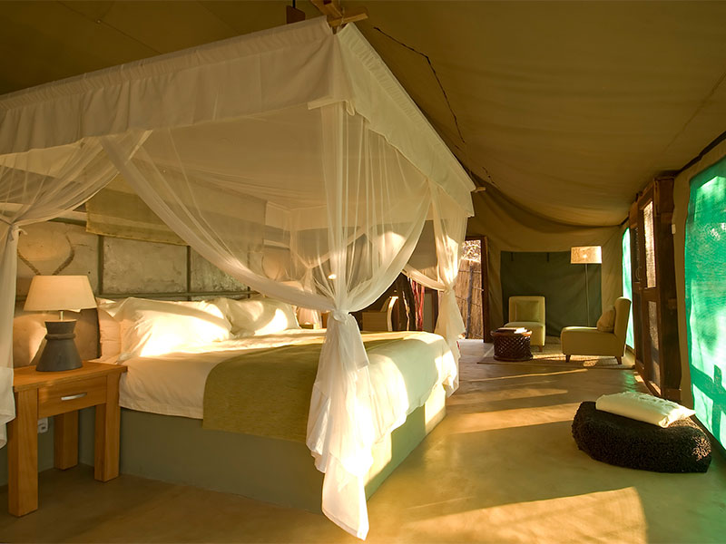 De zeven ruime luxe tenten zijn voorzien van een en-suite badkamer met bad en een binnen- en buitendouche, een privé veranda met een prachtig uitzicht over de vlaktes, muskietennet, plafondventilator en een haardroger. Vanaf uw veranda heeft u een adembenemend uitzicht over de vlaktes en het wild.