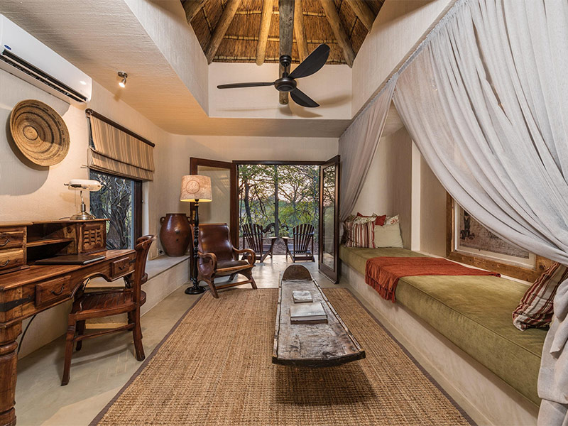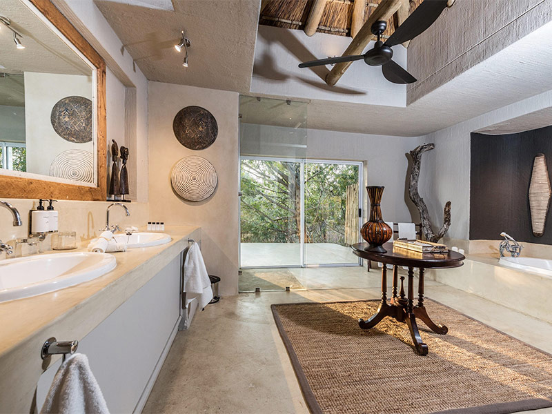 De 25 suites in Afrikaanse stijl zijn allen voorzien van een en-suite badkamer (bad, douche binnen en buiten, haardroger en toilet), airco, ventilator, minibar, thee- en koffiefaciliteiten, telefoon, privé patio en een kluisje.Verder is er een restaurant, wijnkelder, bar, boma, spa en een zwembad.