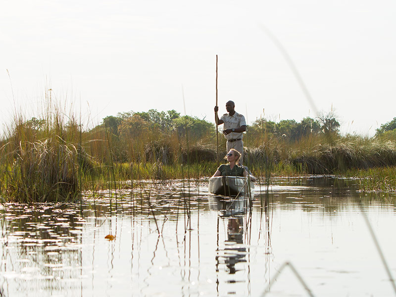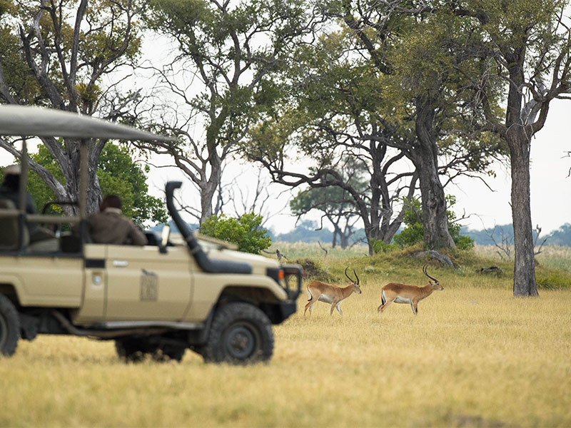 Twee keer per dag game‑drives (inclusief nachtelijke ritten binnen de concessie), mokoro‑tochten, vogelspotten (400+ soorten), optionele dagtrips in Moremi, wandelingen en spectaculaire helikoptervluchten.