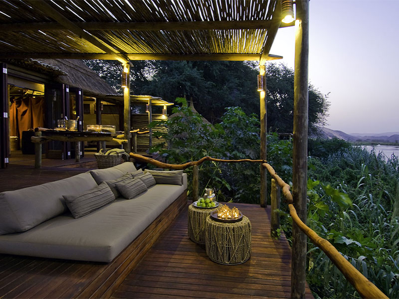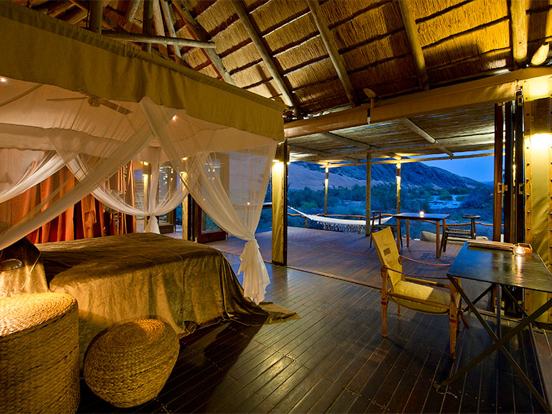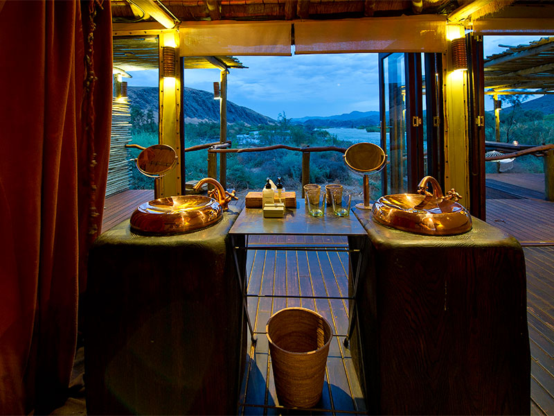 Het kamp is gelegen onder de oude Albida bomen aan de oever van de enige permanent stromende rivier in deze regio: de Kunene Rivier. Het kamp is opgebouwd uit acht tenten met rieten dak, gebouwd op een verhoogd terras. Elk chalet heeft een en-suite badkamer. Het restaurant, de bar en het zwembad hebben een centrale ligging.