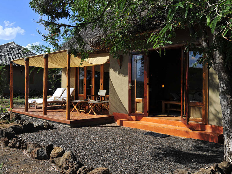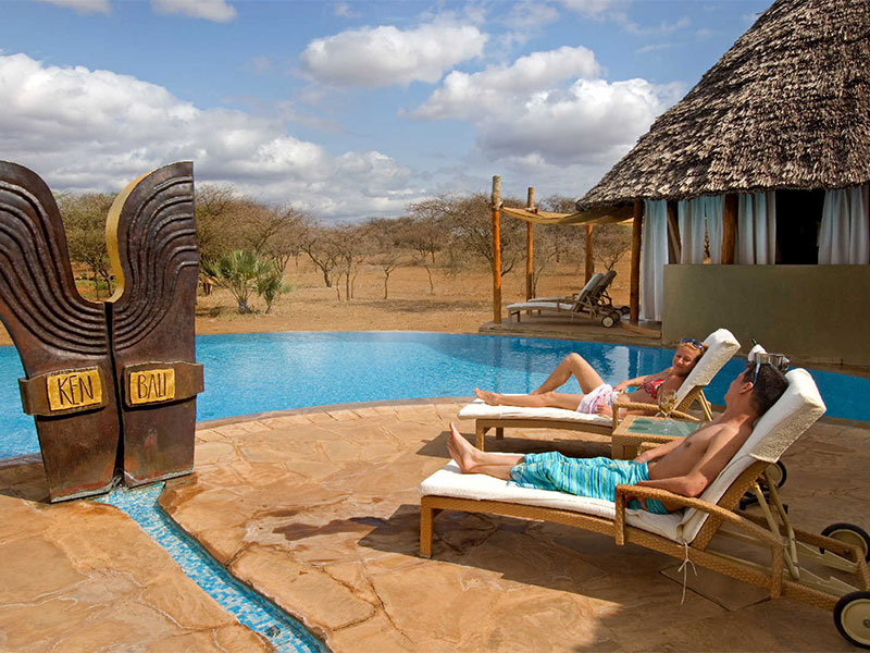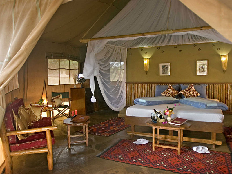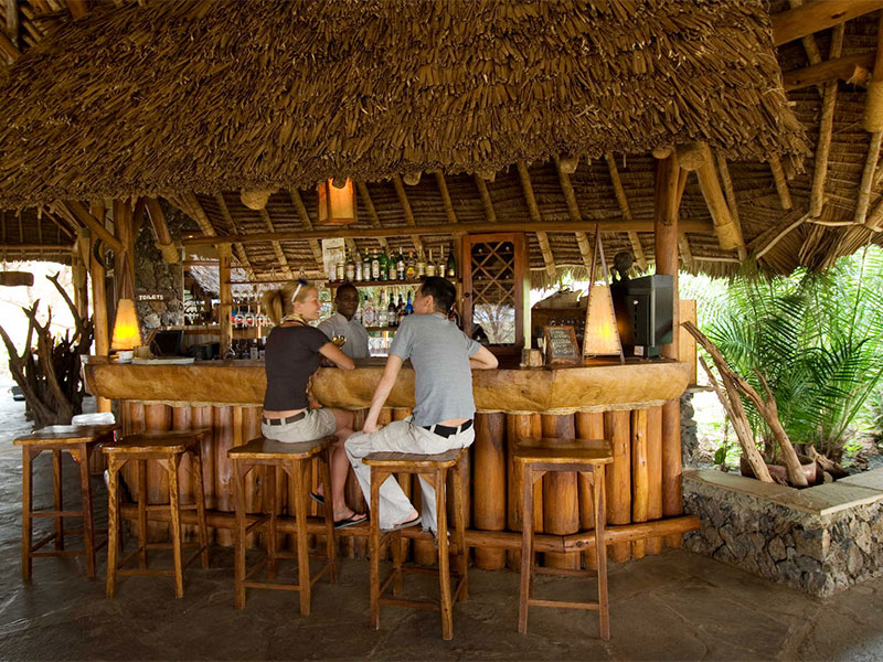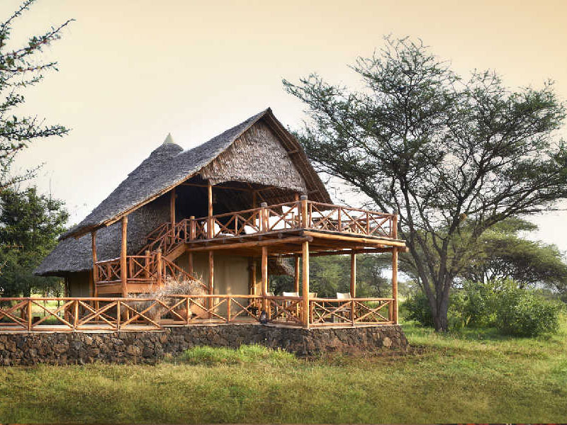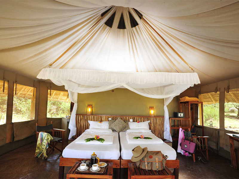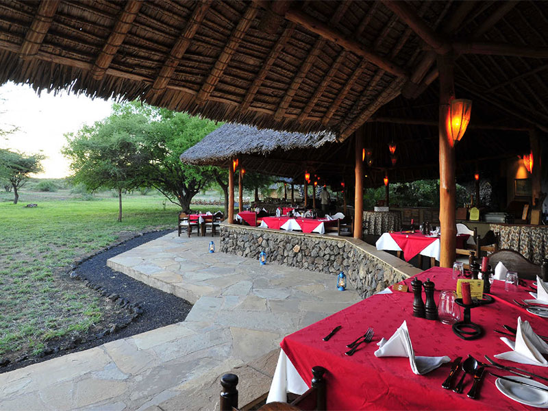 Een apart gebouw biedt een restaurant en de Thorn Tree bar. Op de achtergrond liggen de Chyulu heuvels en de sneeuwbedekte Kilimanjaro. U wordt gewekt met een kopje koffie of thee in uw tent, waarna u op safari gaat in half-open 4x4 safarivoertuigen.