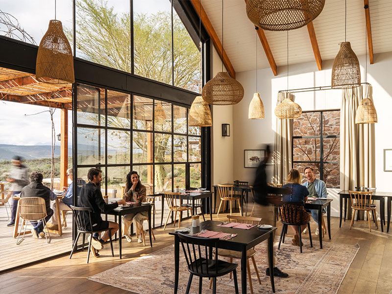De lodge zelf biedt een reeks faciliteiten, zoals een groot buitenzwembad, een gezellige lounge met open haard, een bar, een bibliotheek en een uitstekend restaurant waar gerechten worden bereid met lokale ingrediënten.