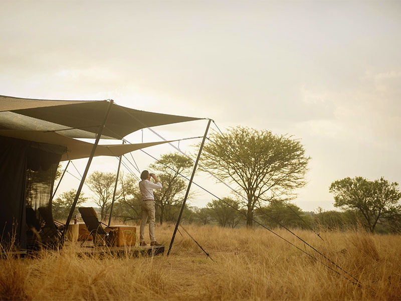 De tenten in bedoeïenenstijl met grote canvas ramen staan op een verhoogd platform met een eigen veranda, zodat je een 360 graden uitzicht hebt over de vlaktes van de Serengeti.