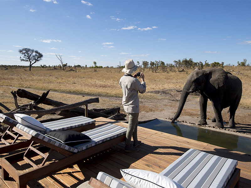 Het hoofdgedeelte omvat een lounge en een eetgedeelte op een verhoogd terras met uitzicht op een klein zwembad, waar olifanten regelmatig hun dorst komen lessen.