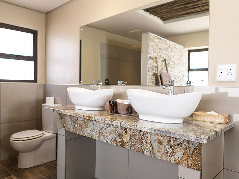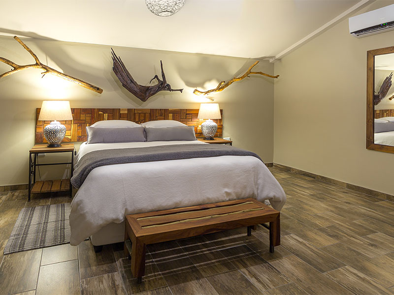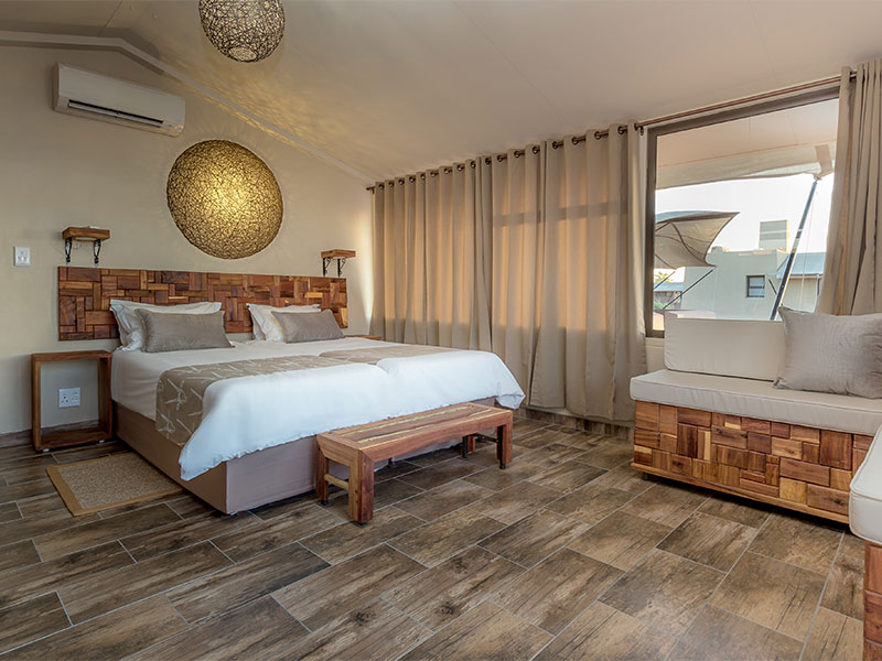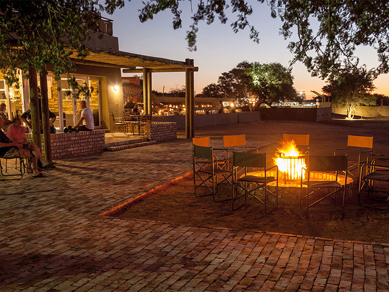Alle bungalows zijn voorzien van badkamers en hebben uitzicht op de immense zandvlaktes. De lodge heeft een sfeervol restaurant met groot terras vanwaar u uitkijkt op de drinkplaats. De met zorg bereide maaltijden zijn in buffetvorm. De lodge beschikt over een zwembad en een bar in Bushmen stijl.