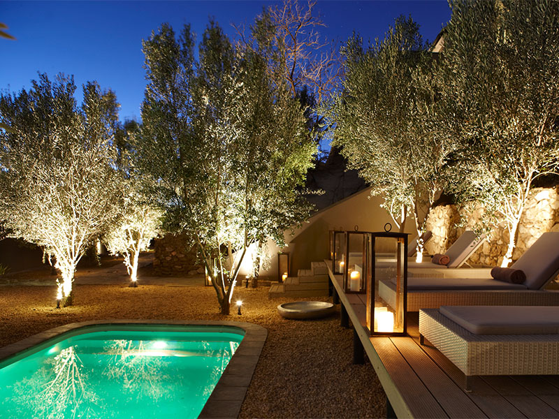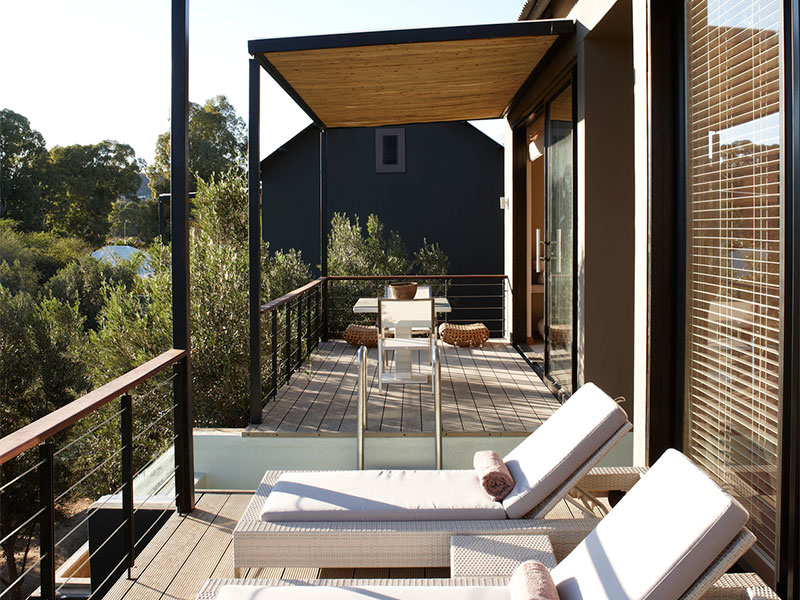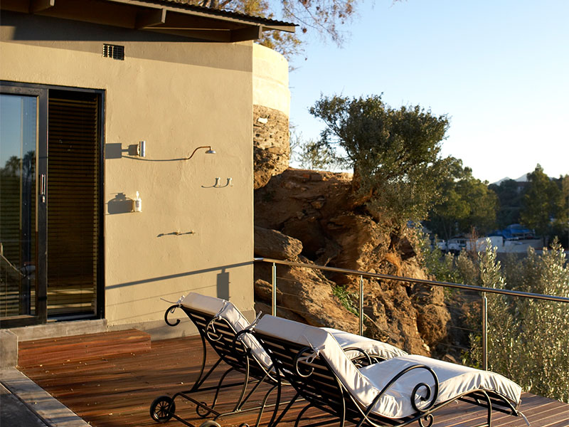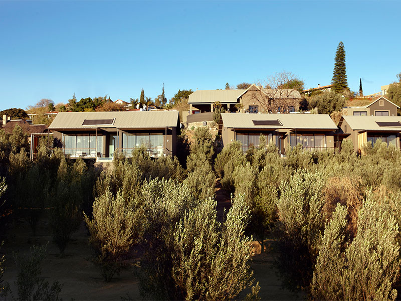 De Olive Exclusive's vier Premier Suites (Caprivi, Etosha, Erongo en Kunene) liggen aan de voorzijde met uitzicht op de olijfgaard en de vallei verderop, en grote glazen ramen benadrukken het uitzicht. Deuren leiden naar een groot terras met een klein zwembad, ligstoelen en een zitje.