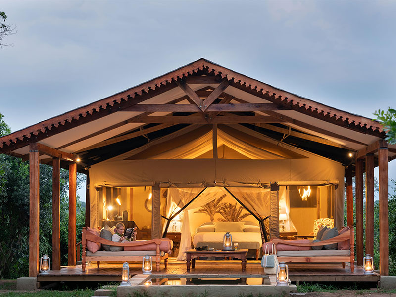 Voor gezinnen of groepen is er een tented cottage met 2 slaapkamers beschikbaar. Elke slaapkamer heeft een eigen en-suite badkamer, een eigen terras en een privé plunge pool. De twee slaapkamers worden gescheiden door een gedeelde woonkamer, ideaal voor privé-diners of ontspannen na een dag vol avonturen.