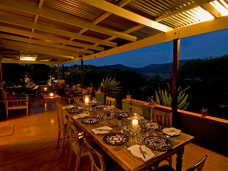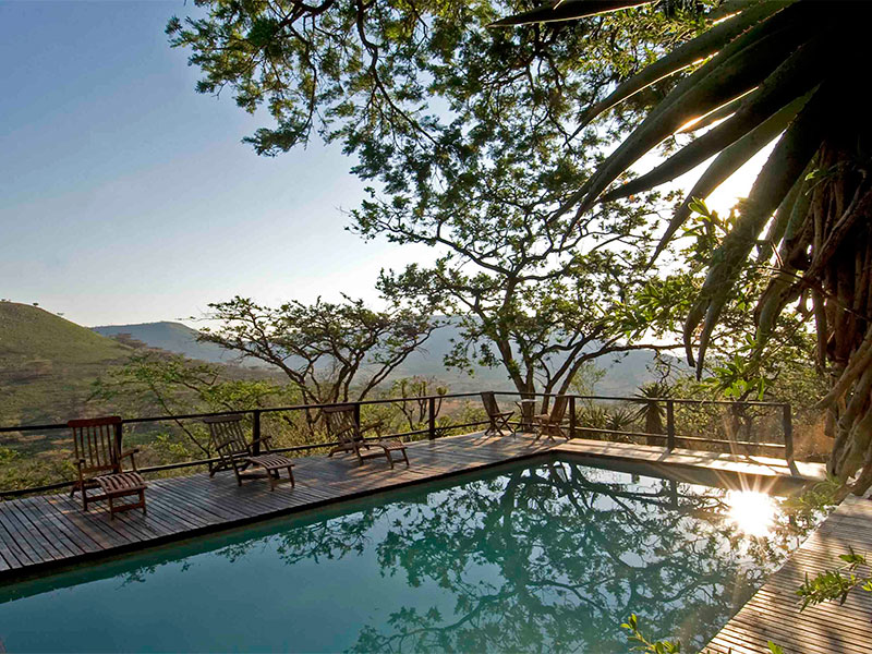 Nabij het hoofdgebouw van de Three Tree Hill Lodge bevindt zich een terras met het zwembad in de schaduw van een Acacia boom.
