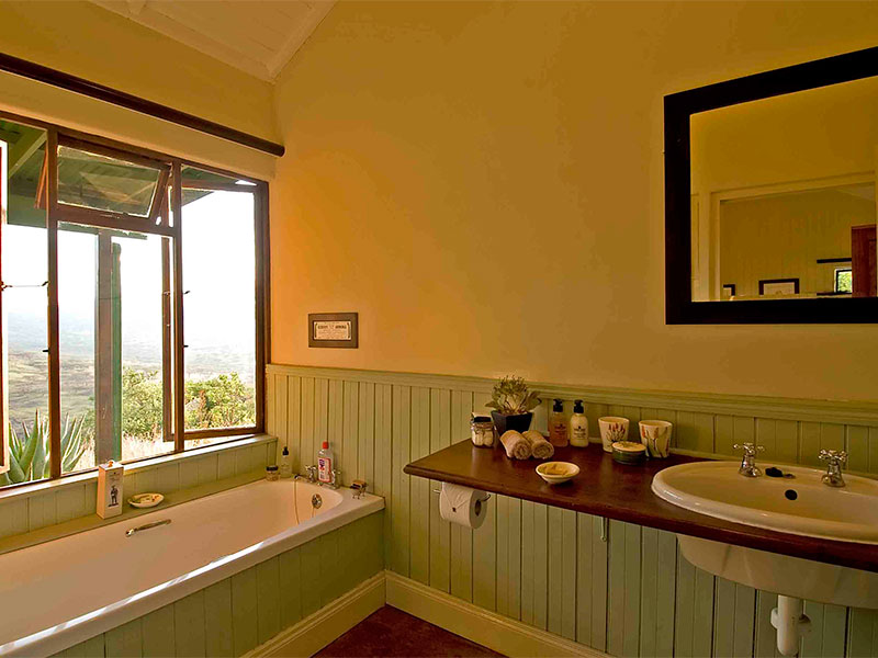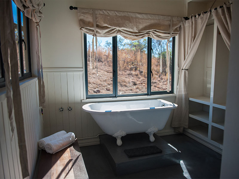 Ook de en-suite badkamer heeft een groot raam met zicht op de valei, zodat u, gelegen in uw bad, wild kunt spotten.