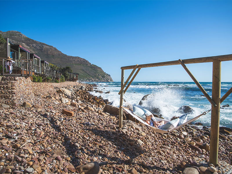 Het kiezelstrand recht tegenover de lodge ligt afgezonderd, bevindt zich in de luwte van de wind en vormt één van de grenzen van het Table Mountain National Park.