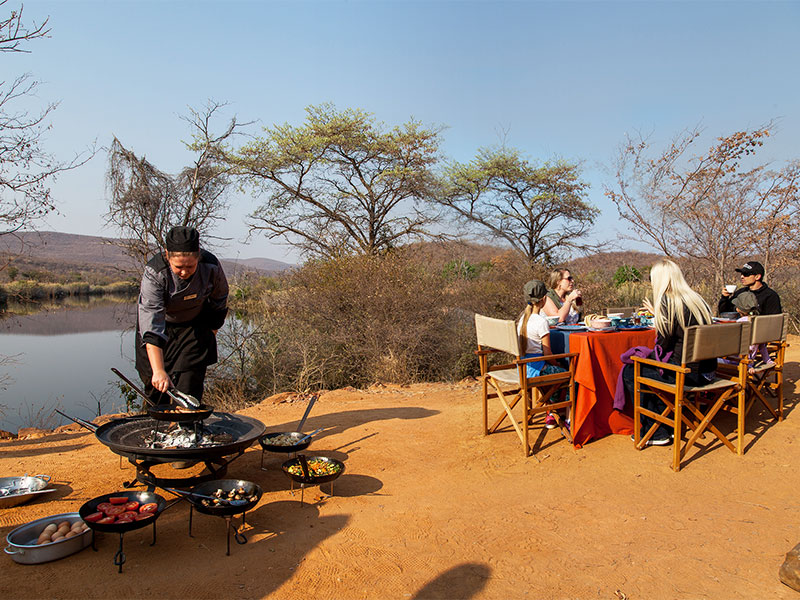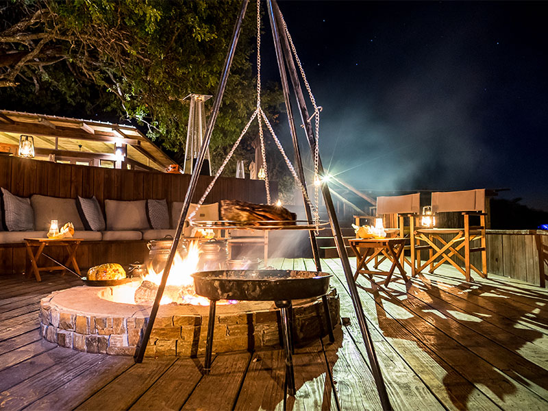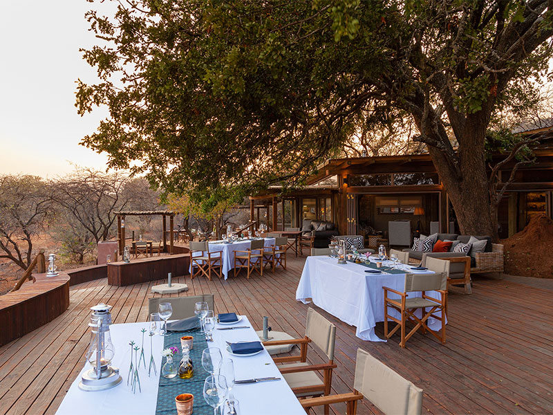 De maaltijden worden geserveerd op de veranda's met uitzicht op de water drinkplaats, onder de sterren in de boma of op uw eigen veranda.