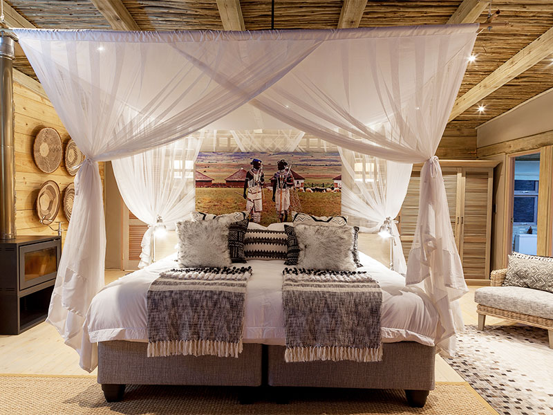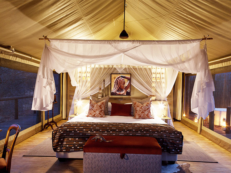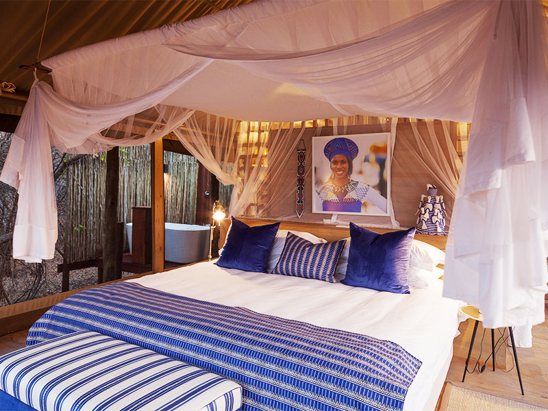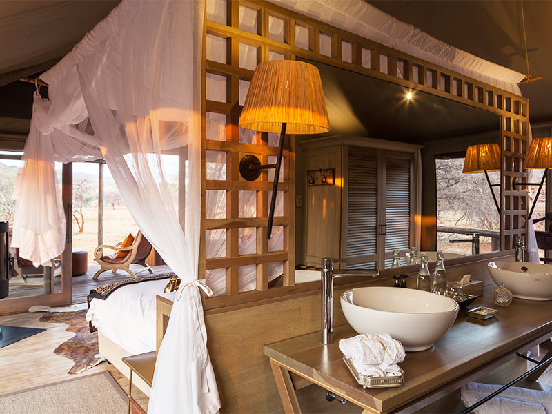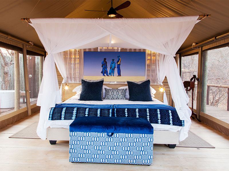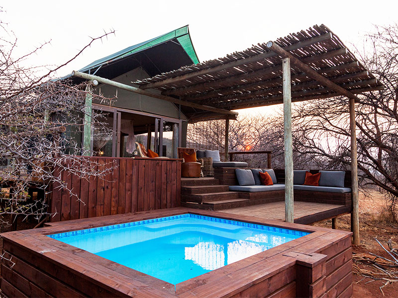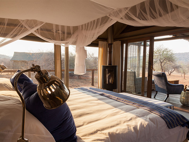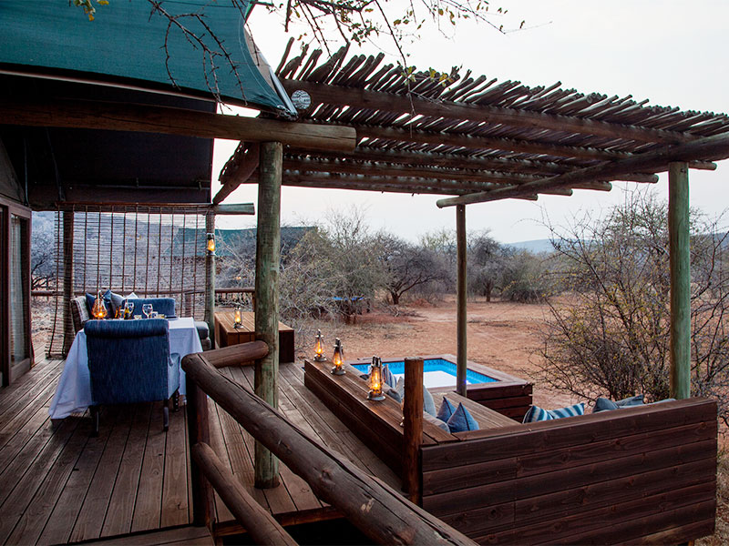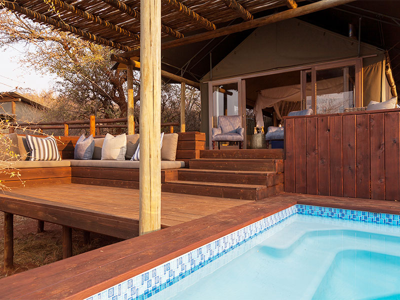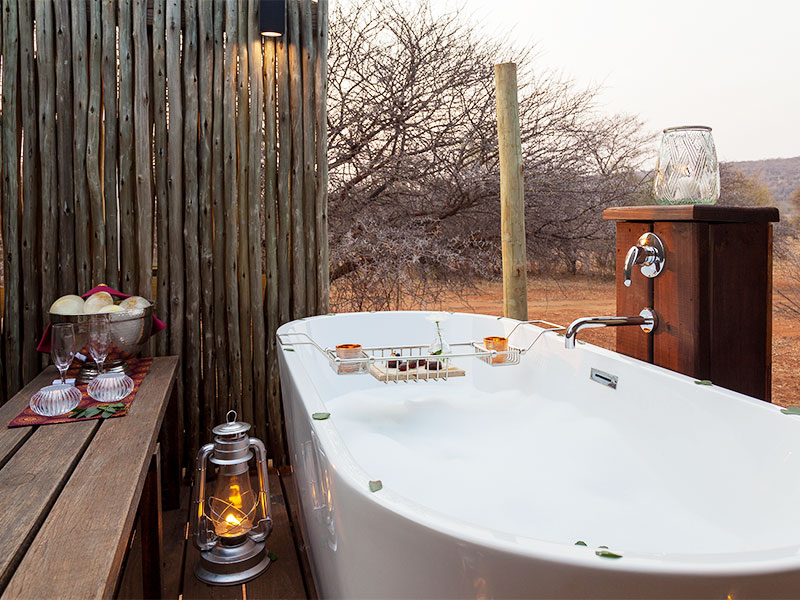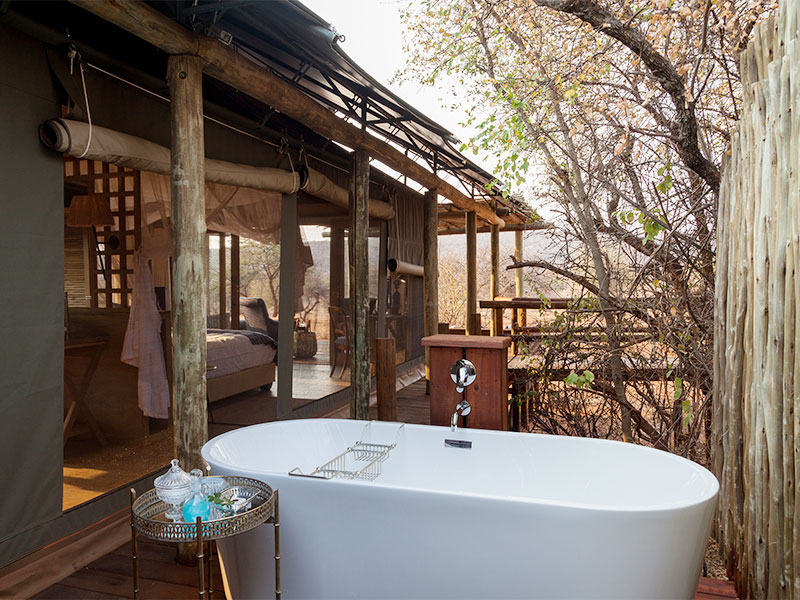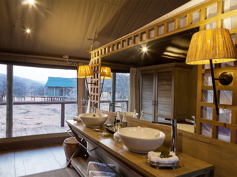 Elke tent kijkt uit op de glooiende bergen van de regio Waterberg en is v.v. airco, een veranda met dompelbad en een en-suite badkamer met bad, binnen- en buitendouche.