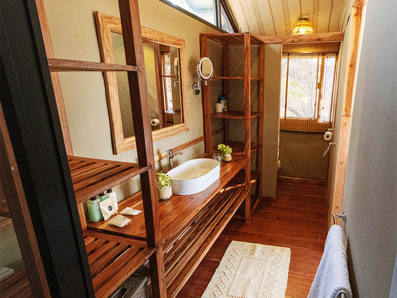 Alle boomhutkamers hebben een eigen badkamer, een houten terras, geïsoleerde canvaswanden, een schuifdeur van glas, ramen en een open balkon.