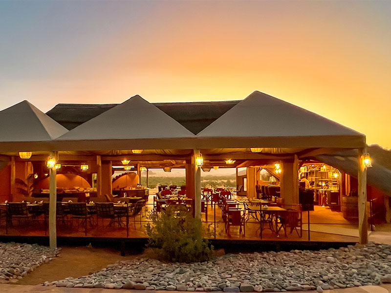 Tot de faciliteiten van Twyfelfontein Adventure Camp behoren een open restaurant en bar met haard, twee zwembaden (waarvan één bij de standaardtenten), een zonneterras, en een uitkijkpunt bereikbaar via een korte wandeling.