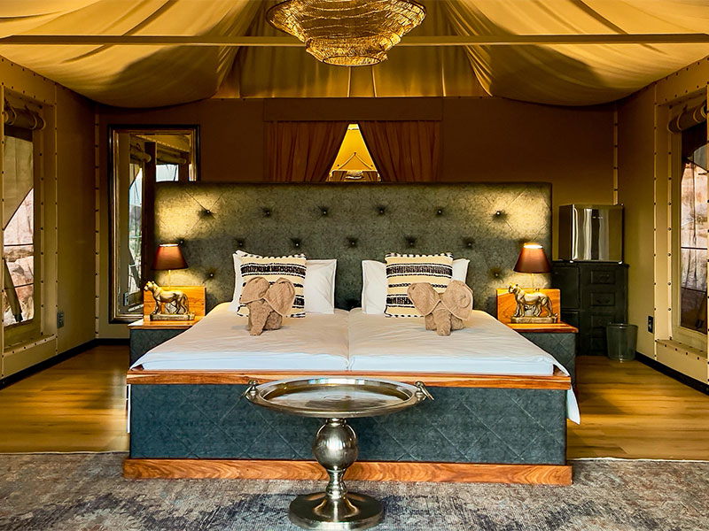 De premiumtenten (54 m²) bieden extra comfort met een minibar, thee- en koffiefaciliteiten, haardroger, en een en-suite badkamer; de familietenten bestaan uit een premiumtent met een aangrenzende standaardtent, verbonden via een houten loopbrug.