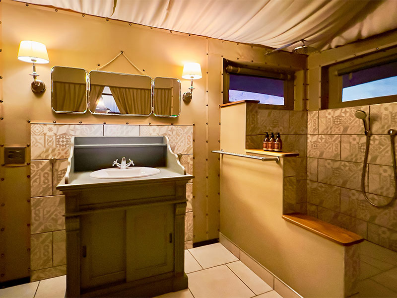 De standaardtenten (15 m²) zijn voorzien van twee eenpersoonsbedden, een halfopen badkamer met douche, wastafel en toilet, een kluisje, Europese en USB-stopcontacten, en een schaduwrijk terras met zitgelegenheid.