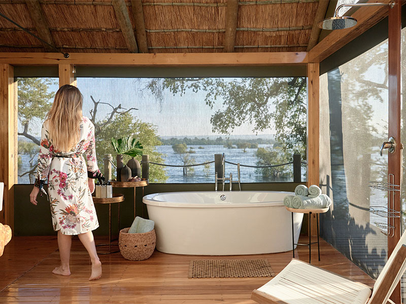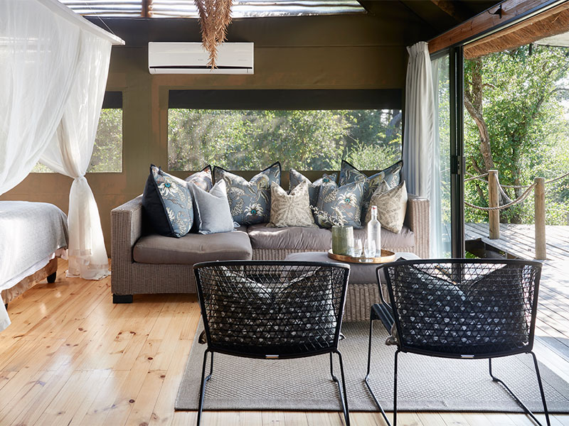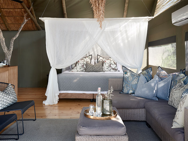 13 Ruime luxe Tented Suites met elk met een eigen terras, een dompelbad en een binnen- en buitendouche.