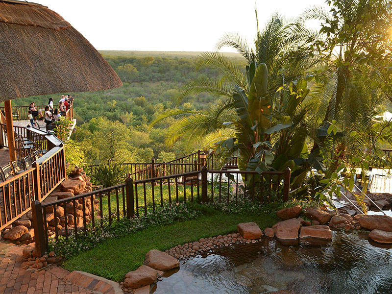 De Victoria Falls Safari Lodge beschikt over een zwembad, een bar met groot terras dat uitzicht biedt op een drinkplaats die in de avond verlicht wordt.