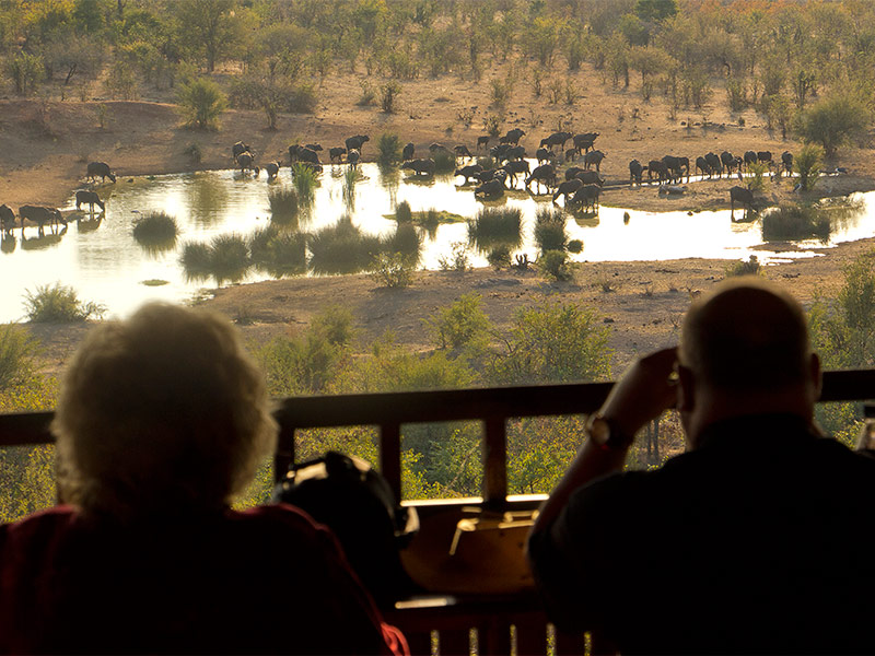 Vanuit de lodge is er vrij uitzicht op de omliggende bush en vanaf de terrassen worden geregeld wilde dieren waargenomen.