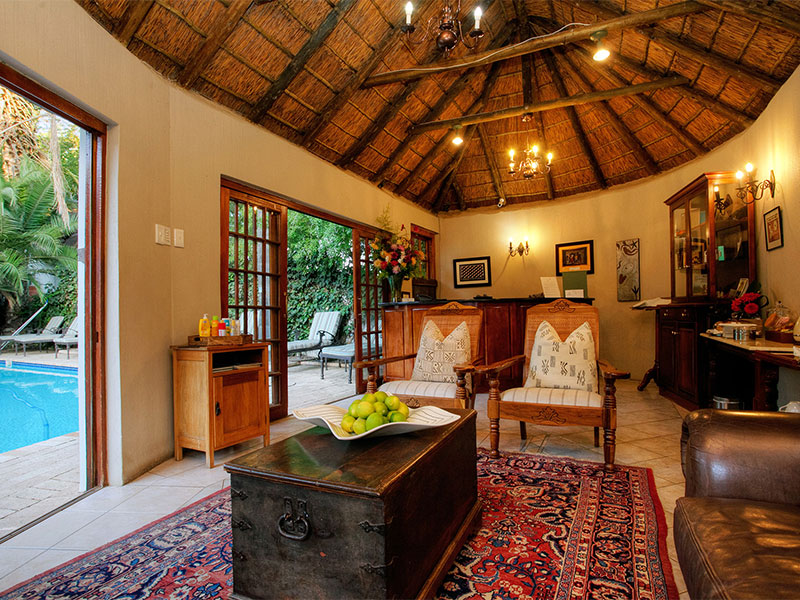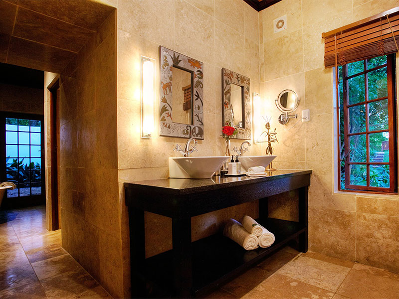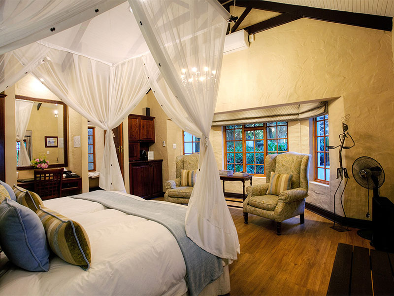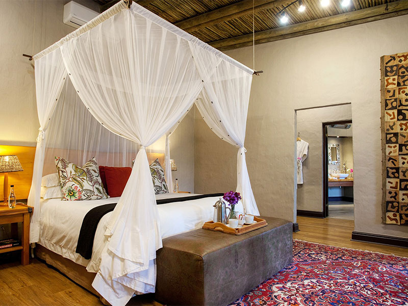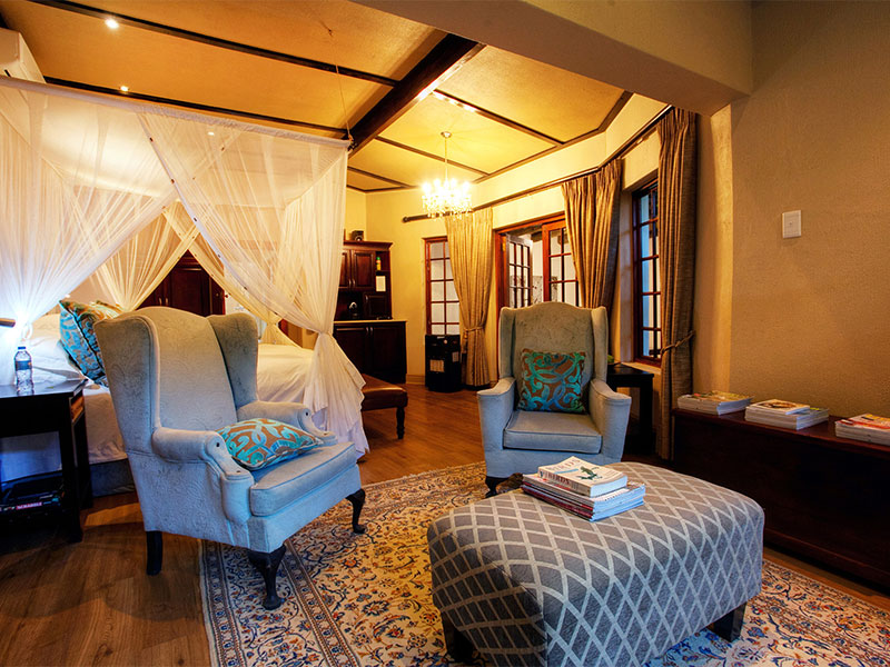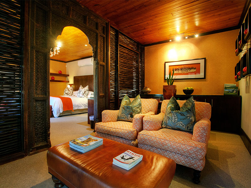 De kamers en de centrale ruimtes zijn smaakvol ingericht met veel Afrikaanse details. In totaal zijn er 11 kamers, die voorzien zijn van airconditioning, verwarming, minibar, koffie/thee faciliteiten, cd-speler, telefoon, föhn, klamboe, kluisje, bad-jassen, bad en aparte douche, buitendouche en een patio. De honeymoon suite ligt boven, is erg ruim, maar heeft geen buitendouche.