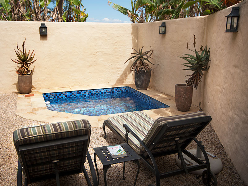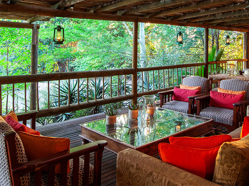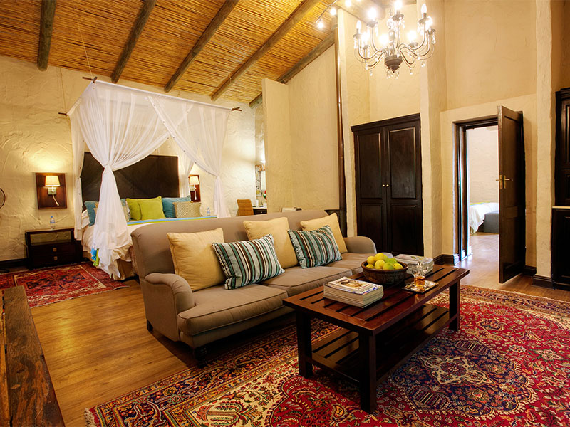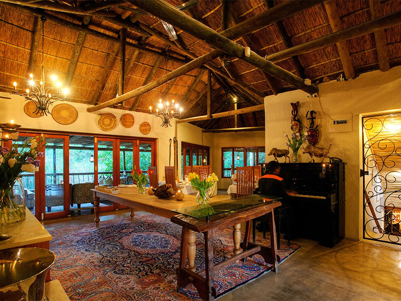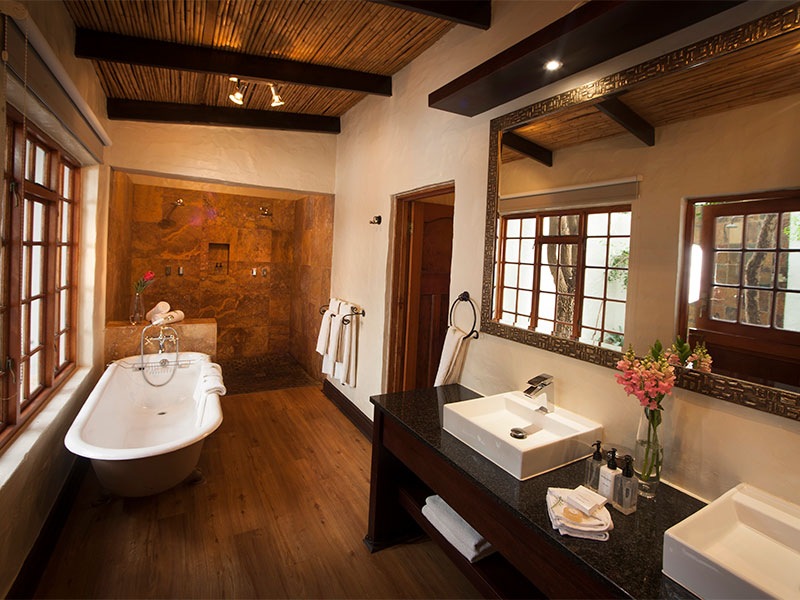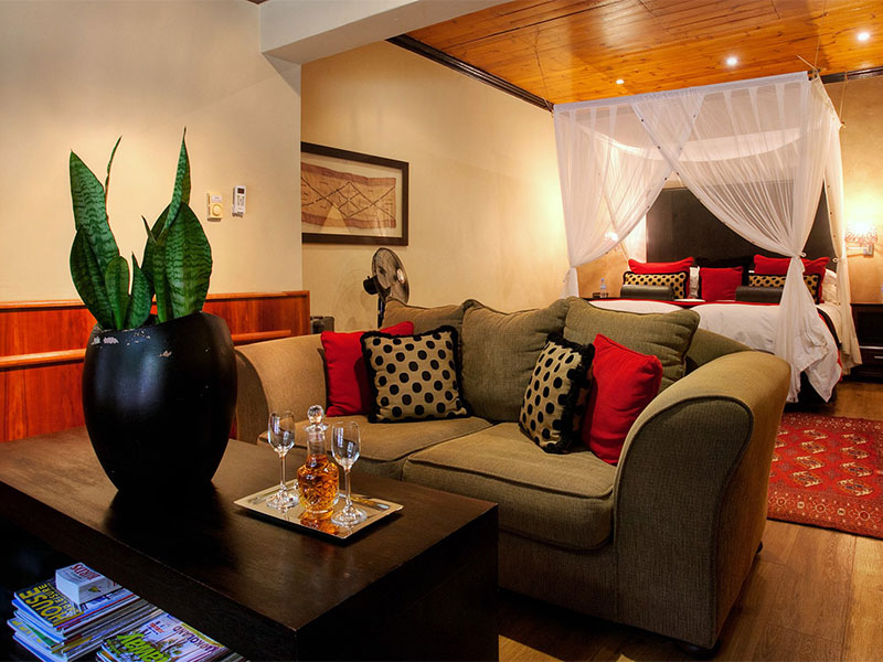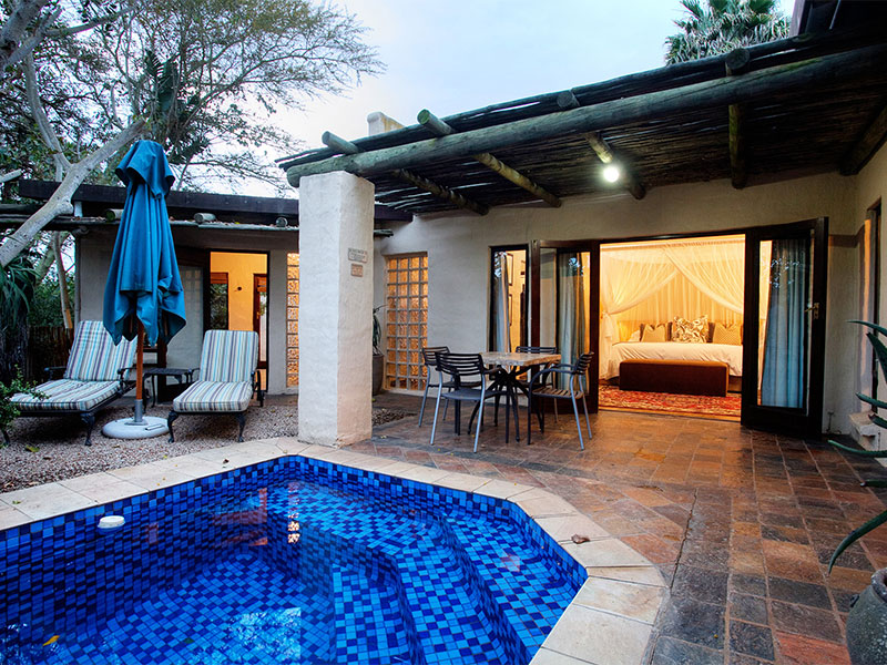 De kamers en de centrale ruimtes zijn smaakvol ingericht met veel Afrikaanse details. In totaal zijn er 11 kamers, die voorzien zijn van airconditioning, verwarming, minibar, koffie/thee faciliteiten, cd-speler, telefoon, föhn, klamboe, kluisje, bad-jassen, bad en aparte douche, buitendouche en een patio. De honeymoon suite ligt boven, is erg ruim, maar heeft geen buitendouche.
