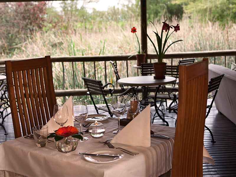 Het restaurant ligt aan een meertje, waar veel verschillende vogels te zien zijn. Bij mooi weer kunt u op het houten dek lunchen en dineren. Het diner bestaat uit een 7-gangen menu en in de winter is het een 3-gangen menu. Er is een kleine wijnkelder, waar u uw eigen wijn kunt uitzoeken. Om 18.00 uur worden hapjes bij het aperitief geserveerd.